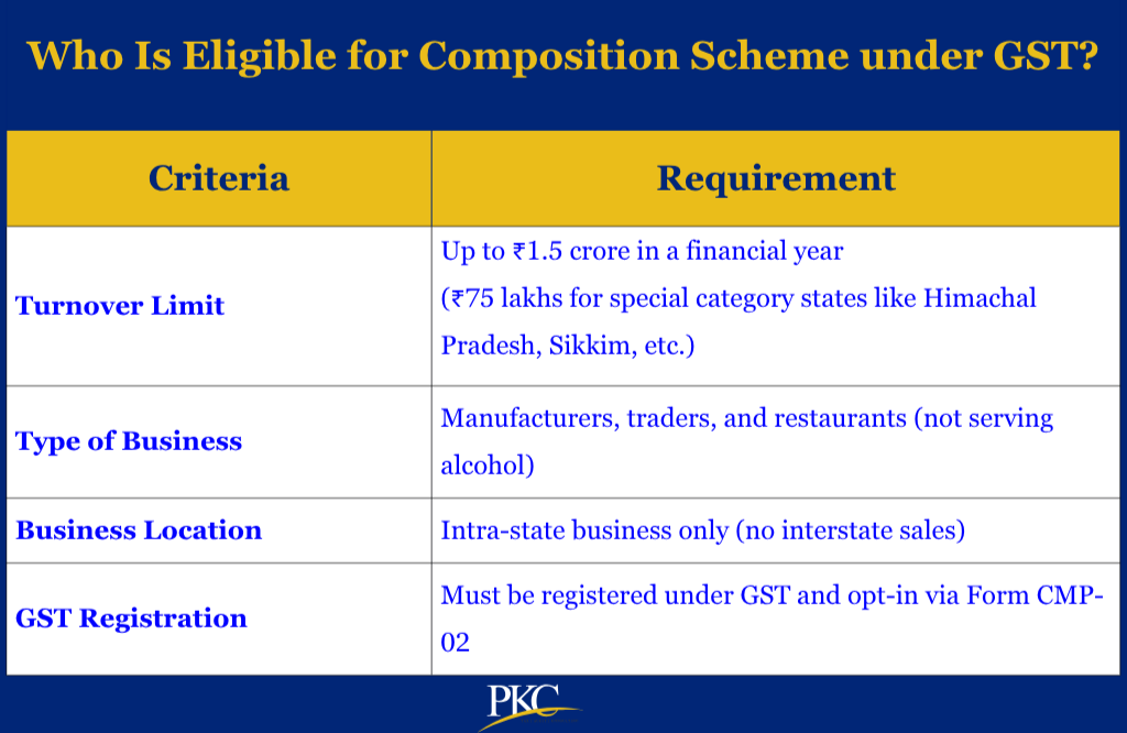 Businesses with a turnover up to ₹1.5 crore (₹75 lakhs in special states) and engaged in intra-state trade of goods or specific services are eligible. Interstate sellers, e-commerce operators, and certain service providers are excluded.