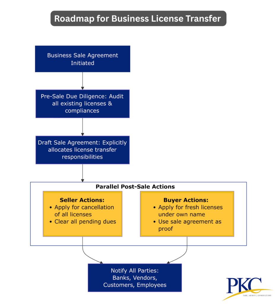 Obtain updated or fresh licenses in the name of the buyer or new entity. Keep soft and hard copies of all approvals for future audits.