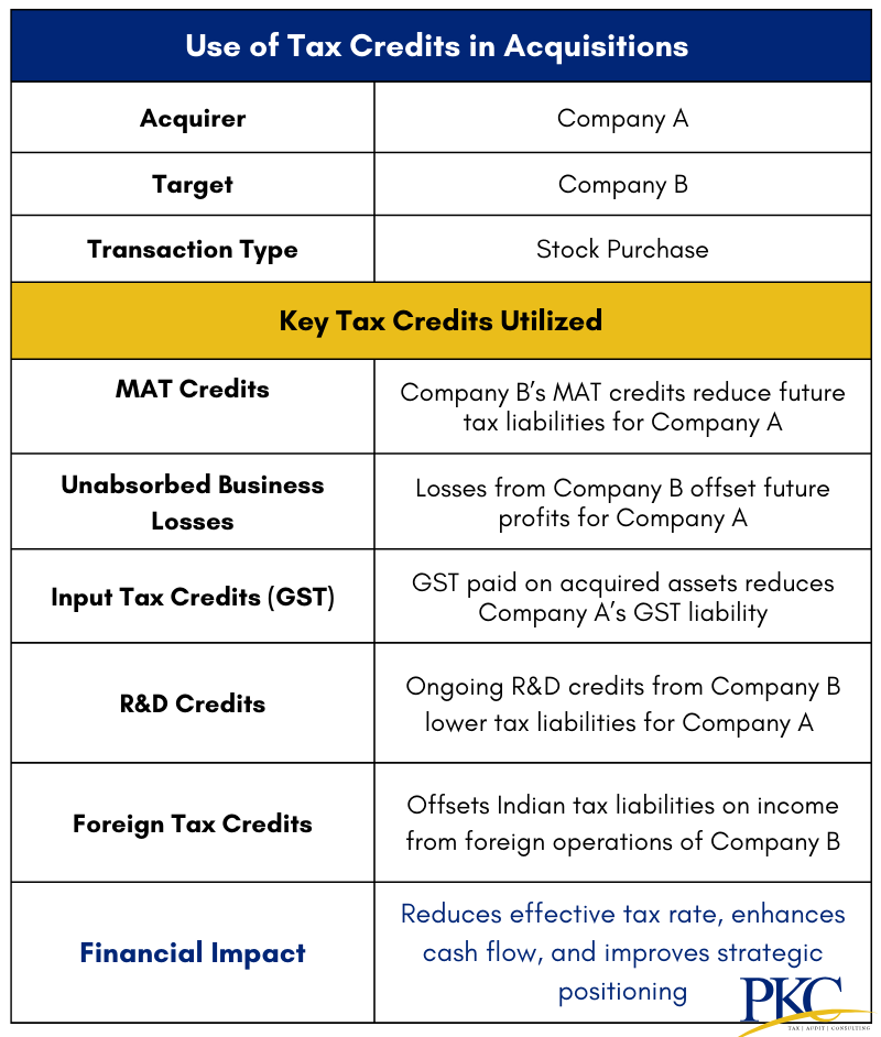 These credits can reduce the tax payable by the surviving entity post-merger, leading to better cash flow management.