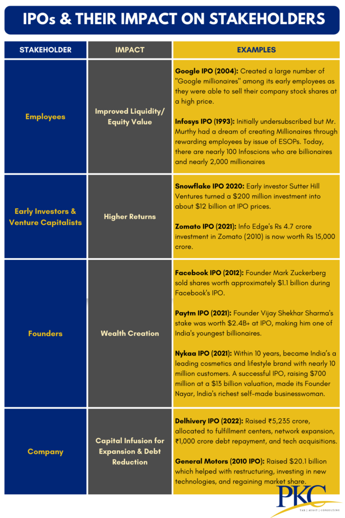 After going public, employees can benefit from Employee Stock Option Plans (ESOPs).