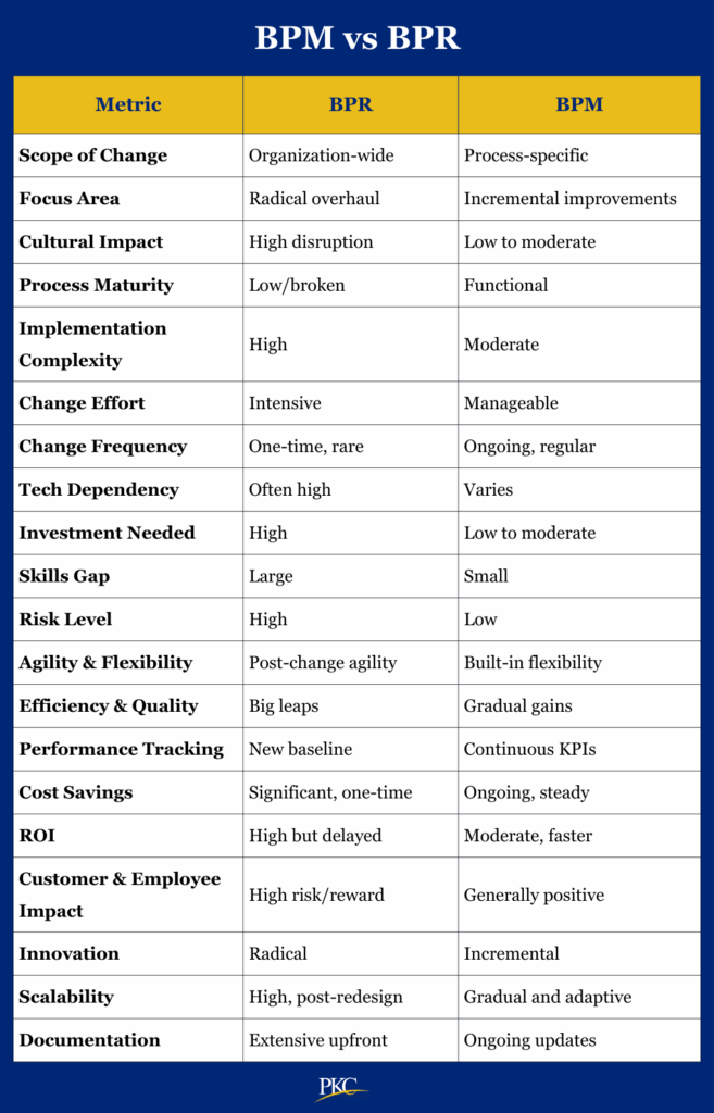 Here’s a metric-by-metric comparison of differences between BPR (Business Process Reengineering) and BPM (Business Process Management) to help businesses determine which is best suited for their needs: