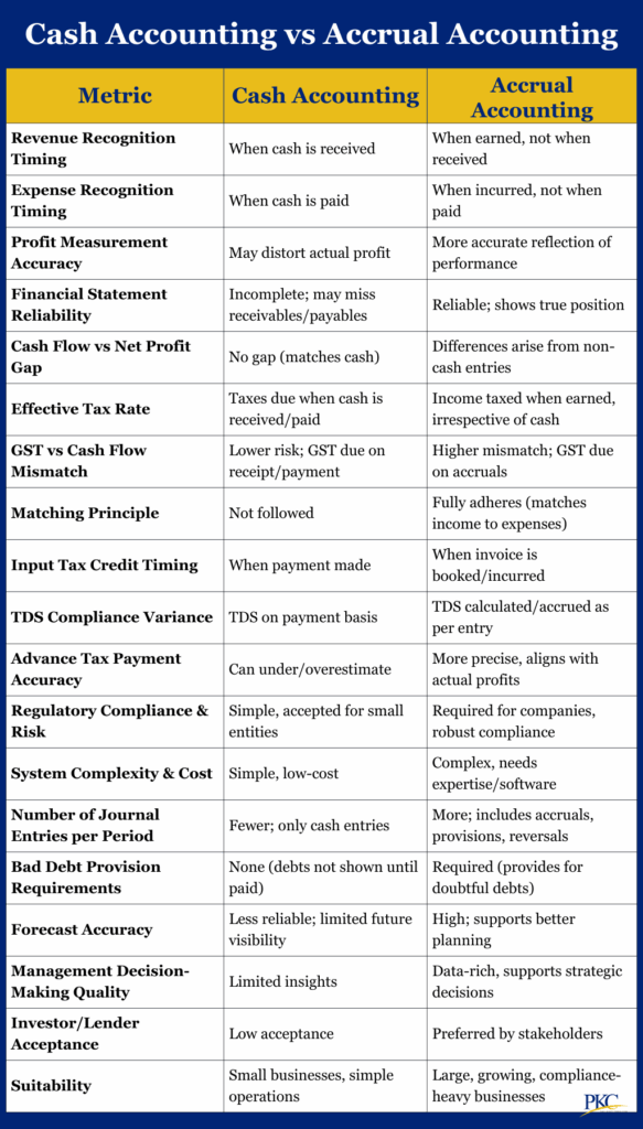 Implications: Cash accounting can offer short-term tax relief and flexibility for small businesses. But accrual accounting gives more consistent tax reporting and better aligns with Indian tax laws.