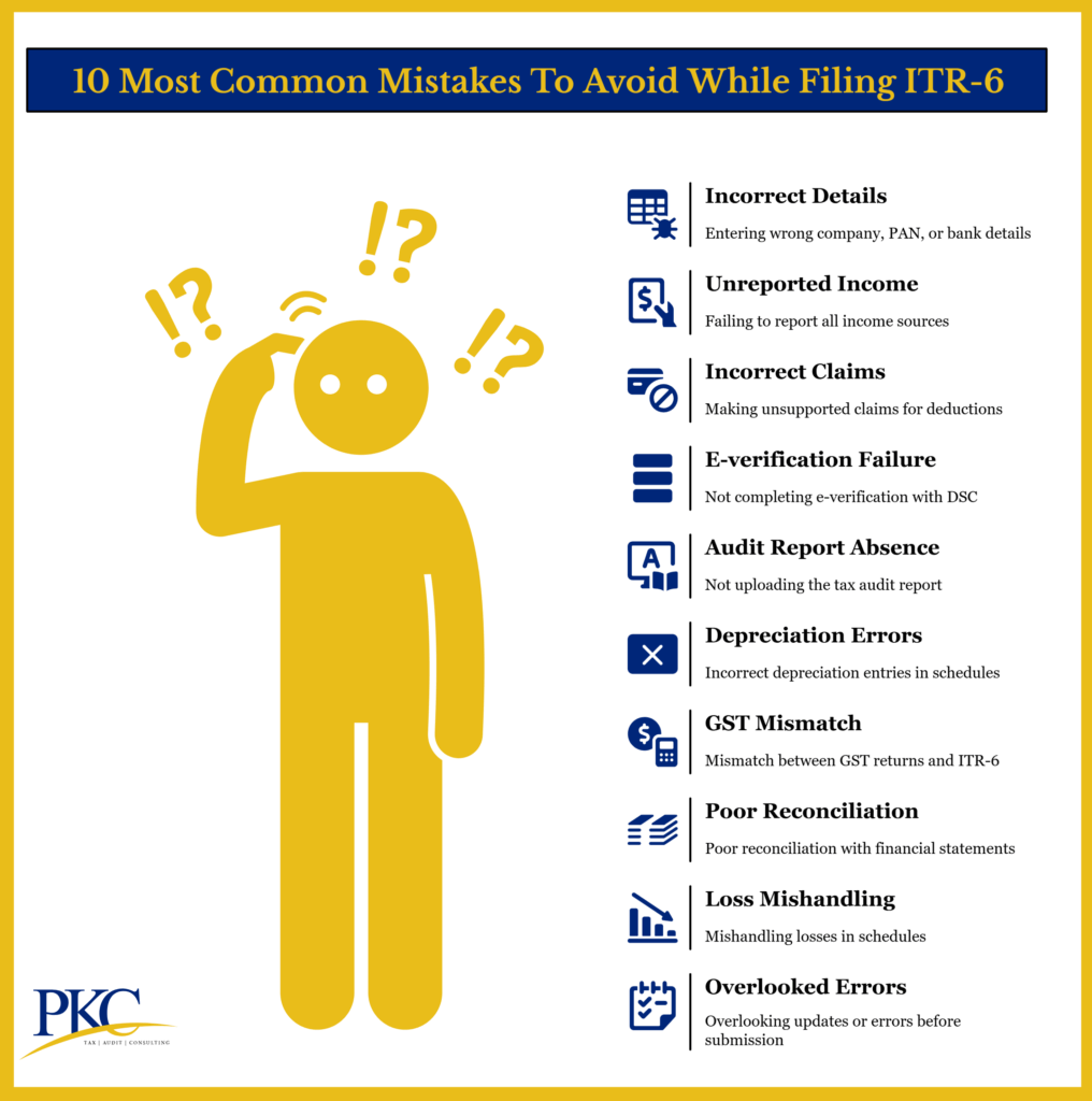 How’s How Can PKC Help With Your ITR 6 Filing ▫️ITR-6 specialists for private limited companies specifically ▫️Proactive penalty avoidance through meticulous error checking ▫️Seamless electronic filing with secure data protection ▫️End-to-end ITR 6 support from preparation to submission ▫️Enhanced accuracy and compliance guaranteed approach ▫️Custom tax calendar and reminders system ▫️Advanced tax audit compliance and scrutiny handling |