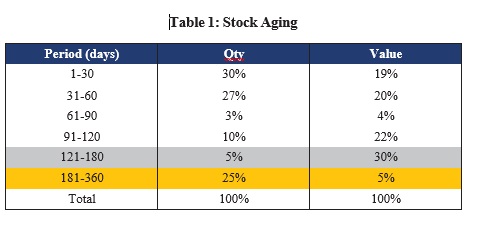 Even though 5% qty is aged > 120D here, Value wise it is 30 per cent. This leads to higher working capital and higher interest/ holding cost. These items need to be liquidated on priority.