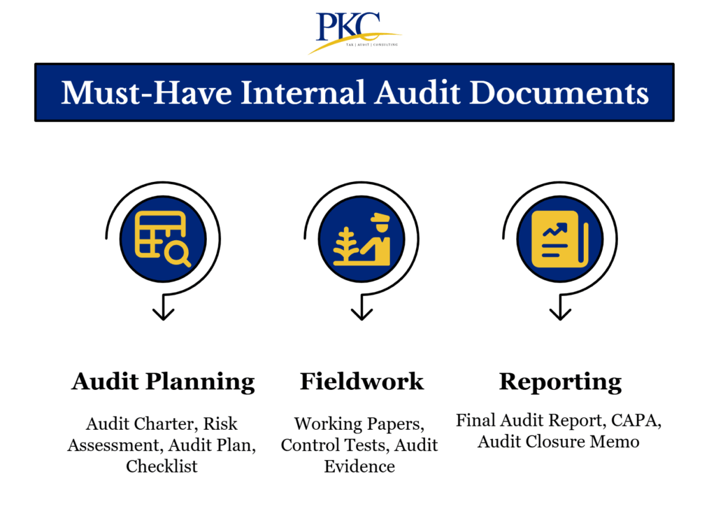 Documents include the audit plan, risk assessments, checklists, working papers, findings reports, and management’s corrective action plans. These form the audit trail and are legally required.