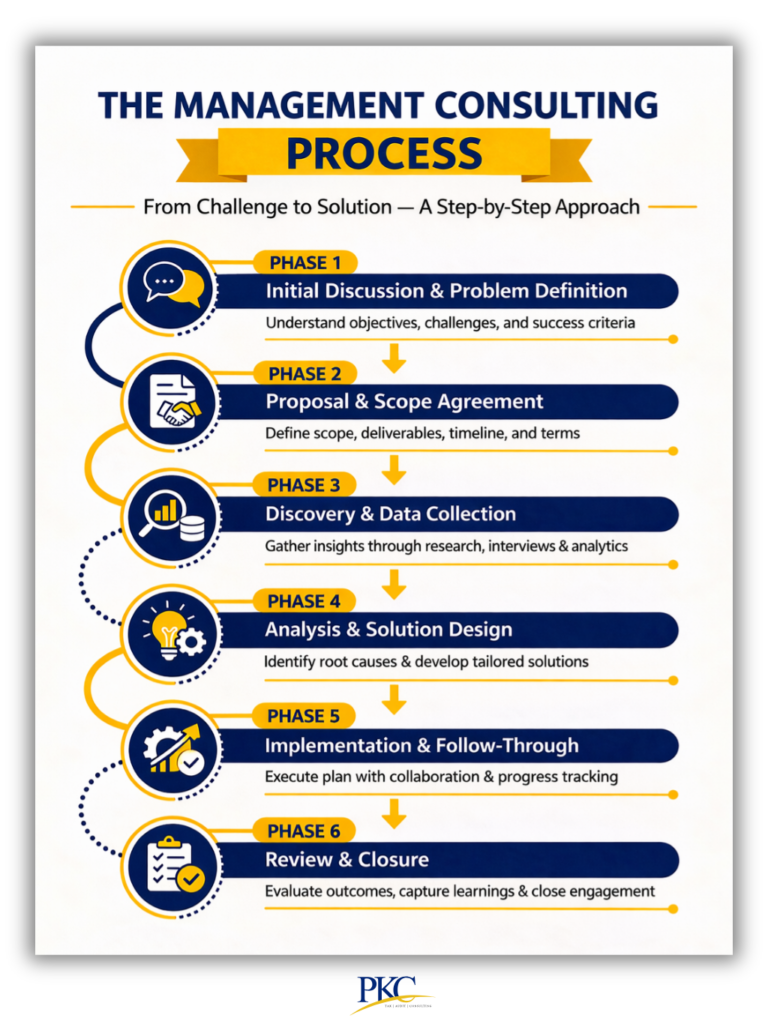 When you engage a consulting firm, you are not paying for opinions. You are paying for a structured process: discovery, analysis, solution design, and implementation support.