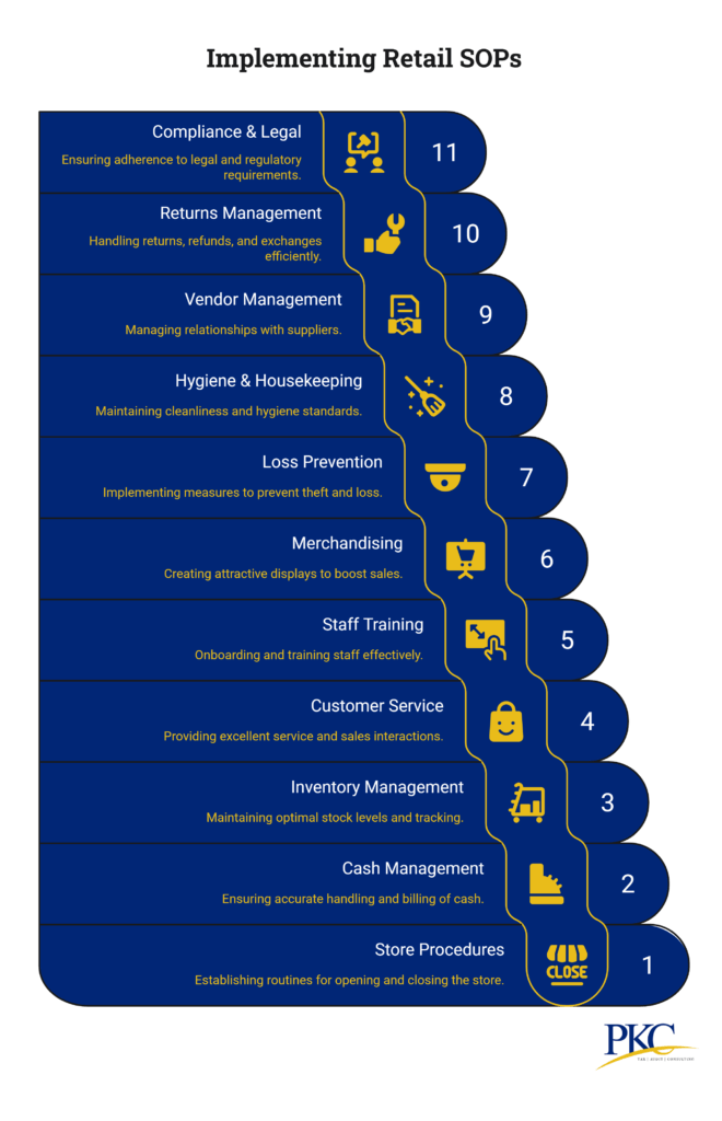 These SOPs guide the overall functioning of a retail business, from compliance to staffing.