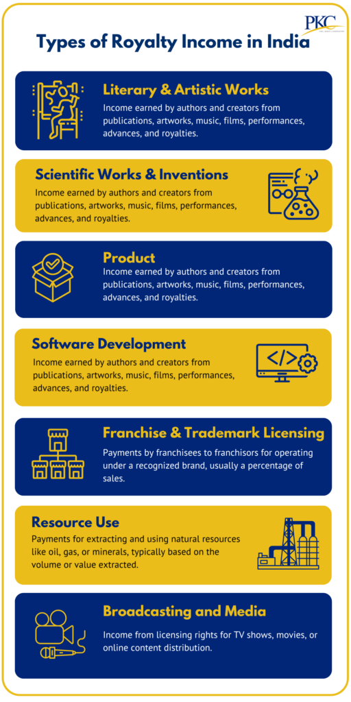 - Profits and Gains of Business or Profession:If an individual or organization owns a business that generates royalties, the revenue is taxed as part of the business’s overall earnings.