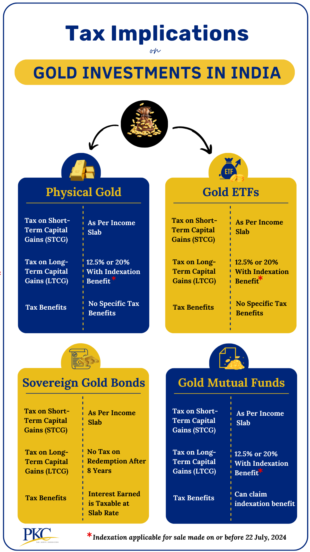 - It is taxed at a flat rate of 12.5% as per the new rules applicable after July 2024. Indexation is no longer applicable on gold investments.
