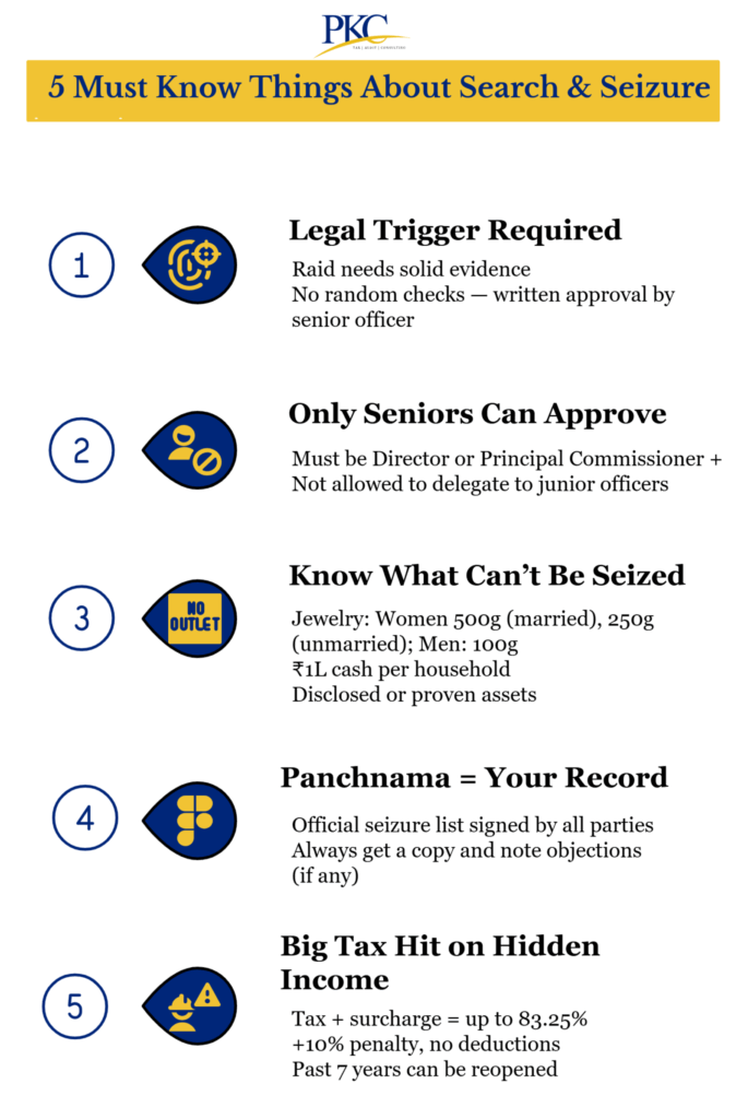 - Seizure Powers: During the search, officials can seize cash, jewellery, books of accounts, documents, and any other valuable items believed to be undisclosed or related to tax evasion. They can also freeze bank accounts and restrict access to undeclared wealth.