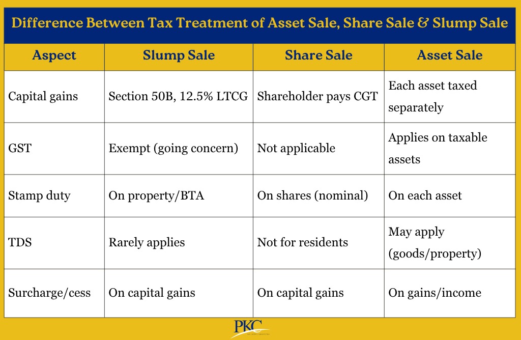 In share sales and slump sales, income tax is usually not applied separately, as the gain is already covered under capital gains.