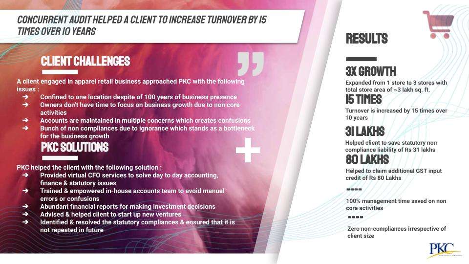 - Helped client to save statutory non compliance liability of Rs 31 lakhs