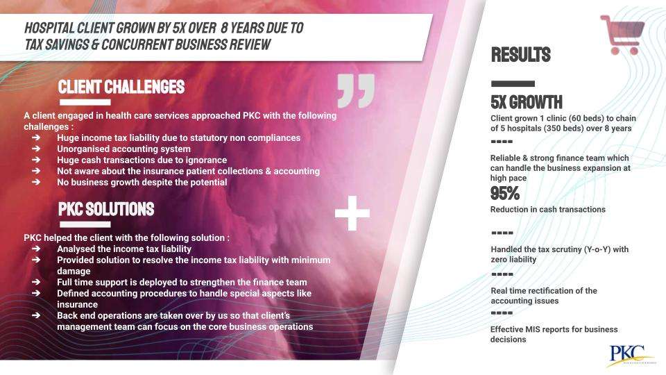 - 5X GROWTH- Client grown 1 clinic (60 beds) to chain of 5 hospitals ( 350 beds) over 8 years