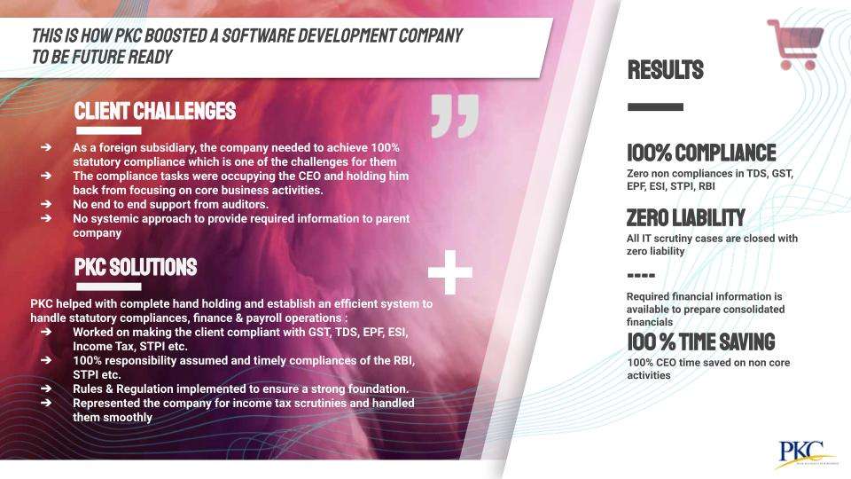 PKC helped with complete hand holding and establish an efficient system to handle statutory compliances, finance & payroll operations: