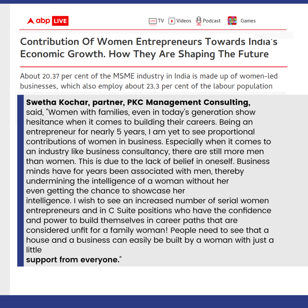 Swetha Kochar, partner, PKC Management Consulting, said, “Women with families, even in today’s generation show hesitance when it comes to building their careers. Being an entrepreneur for nearly 5 years, I am yet to see proportional contributions of women in business. Especially when it comes to an industry like business consultancy, there are still more men than women. This is due to the lack of belief in oneself. Business minds have for years been associated with men, thereby undermining the intelligence of a woman without her even getting the chance to showcase her intelligence. I wish to see an increased number of serial women entrepreneurs and in C Suite positions who have the confidence and power to build themselves in career paths that are considered unfit for a family woman! People need to see that a house and a business can easily be built by a woman with just a little support from everyone.”